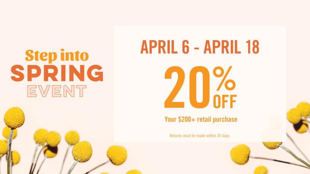 We’re excited to announce that our Step Into Spring Event is back! From April 6 – 18th, 2026, visit any of our locations and receive 20% off your retail purchase over $200.